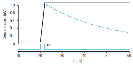 Calcium transients in a 1.0 single cylindrical compartment, 1 μm in diameter and 1 μm in length (similar in size to a spine head). Initial concentration is 0.05 μM. Influx is due to a calcium current of 5 μA cm−2, starting at 20 ms for 2 ms, across the radial surface. Black line: accumulation of calcium with no decay or extrusion. Blue line: simple decay with τdec = 27 ms. Gray dashed line: instantaneous pump with Vpump = 4 × 10−6 μMs−1, equivalent to 10−11 mol cm−2 s−1 through the surface area of this compartment, Kpump = 10 μM, Jleak = 0.0199 × 10−6 μMs−1.