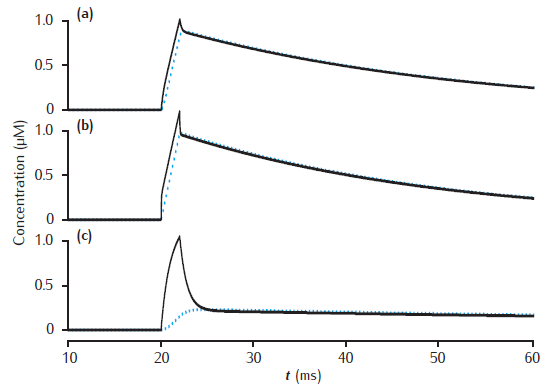 Calcium transients in the submembrane shell (black lines) and the compartment core (blue dashed lines) of a two pool model that includes a membrane-bound pump and diffusion into the core. Initial concentration Ca0 is 0.05 μM throughout. Calcium current as in Figure 6.3. Compartment length is 1 μm. (a) Compartment diameter is 1 μm, shell thickness is 0.1 μm; (b) Compartment diameter is 1 μm, shell thickness is 0.01 μm; (c) Compartment diameter is 4 μm, shell thickness is 0.1 μm. Diffusion: DCa = 2.3 × 10−6 cm2 s−1; Pump: Vpump = 10−11 mol cm−2 s−1, Kpump = 10 μM, Jleak = Vpump ∗ Ca0/(Kpump + Ca0).